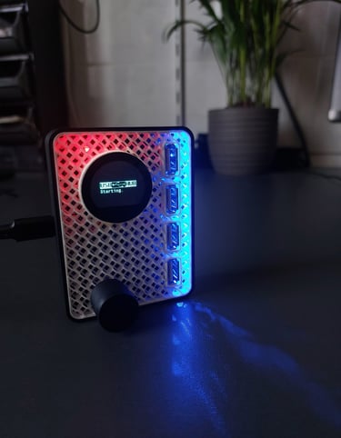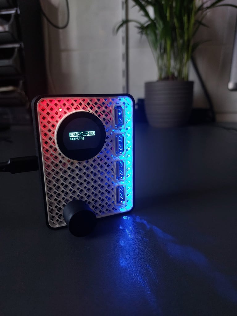 A device that expands a single USB-C port into four USB-A ports using the USB2514B-I/M2 controller for USB 2.0 communication. An STM32 microcontroller and a 0.96" IPS display enable monitoring of the power consumption of each USB port on the screen, with control via a potentiometer located on the top of the enclosure.