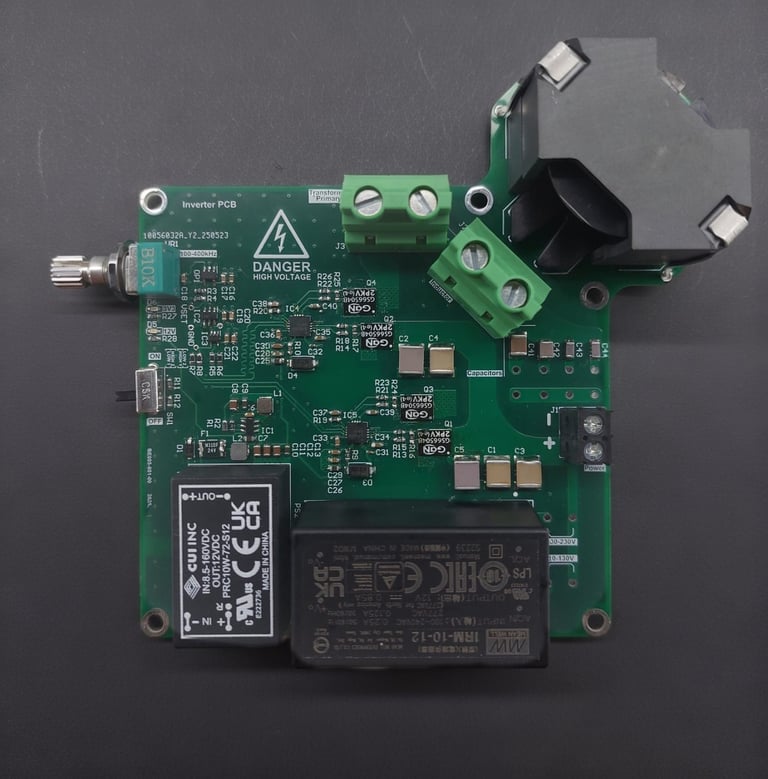 High-voltage inverter PCB intended for experimental testing of electroaerodynamic systems. The inverter is designed as a full-bridge converter with manual frequency control for analyzing system efficiency, losses, and operational limits under laboratory conditions.
